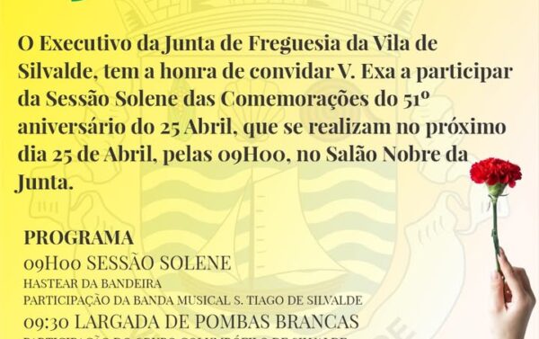 CONVITE O Executivo da Junta de Freguesia da Vila de Silvalde, tem a honra de convidar V. Exa a participar da Sessão Solene das Comemorações do 51º aniversário do 25 Abril, que se…