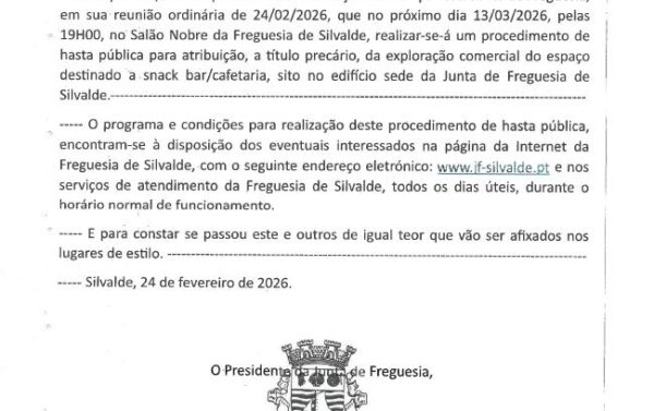 ➡️HASTA PÚBLICA do Snack Bar / Cafetaria sito no Edifício da Junta de Freguesia de Silvalde | 13/03/2026 | 19H00 ⚠️Os interessados deverão dirigir-se à secretaria da Junta de Freguesia de Silvalde para…
